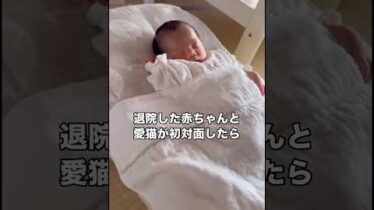 初めて見るちっちゃな人間を目の当たりにした時の愛猫の表情🐱初めは無理に近づかせず扉1枚越しから共同生活スタート。 #保護猫 #ハチワレ #赤ちゃんと猫 #子猫